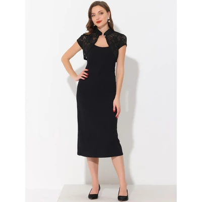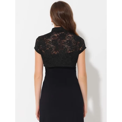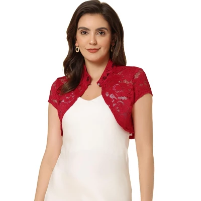 An elegant stand collar and short sleeves make this beautiful lace cardigan a great outfit for any occasion. This lace bolero is perfect for a wedding dress. Team it with a sleeveless dress and a mini bag to complete the elegant look. Lend an understated detail to your formal ensemble with this cropped bolero.