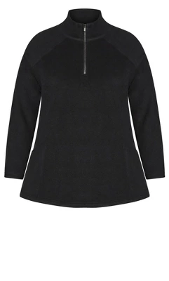 - Solid rib trim at neck, cuffs and sweep